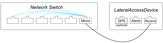 Sample Configurations for Professional Users: LAD Packet Capture with Mirror PortsLAD's packet capture capabilities are also very handy when used in conjunction with the mirroring functionality of your switch (aka its SPAN port). This is of great advantage if you want to have packet capture on the switch's traffic, but not passthrough capture for whatever reason. Simply place LAD right next to your switch and connect it to the mirror/SPAN port.